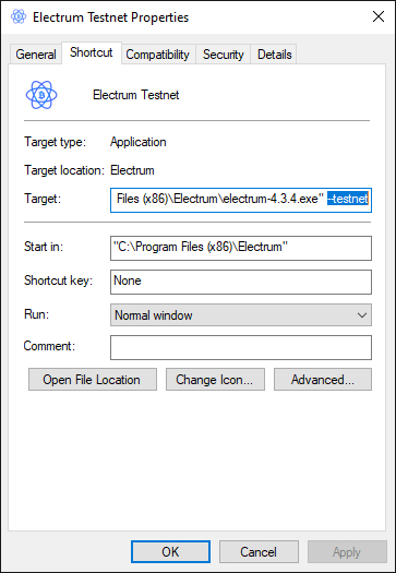 | Wallet | Use Electrum in testnet mode. To enable Electrum test mode in Windows, complete the installation and create a shortcut for electrum.exe. Open the shortcut properties window, then open the Shortcut tab and add at the end of the target string the value --testnet. |