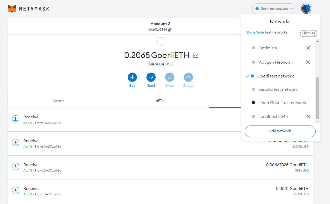 | Wallet | Use MetaMask. To enable the Ethereum Goerli network click the top right network label and then click Add network, select the Goerli network. |