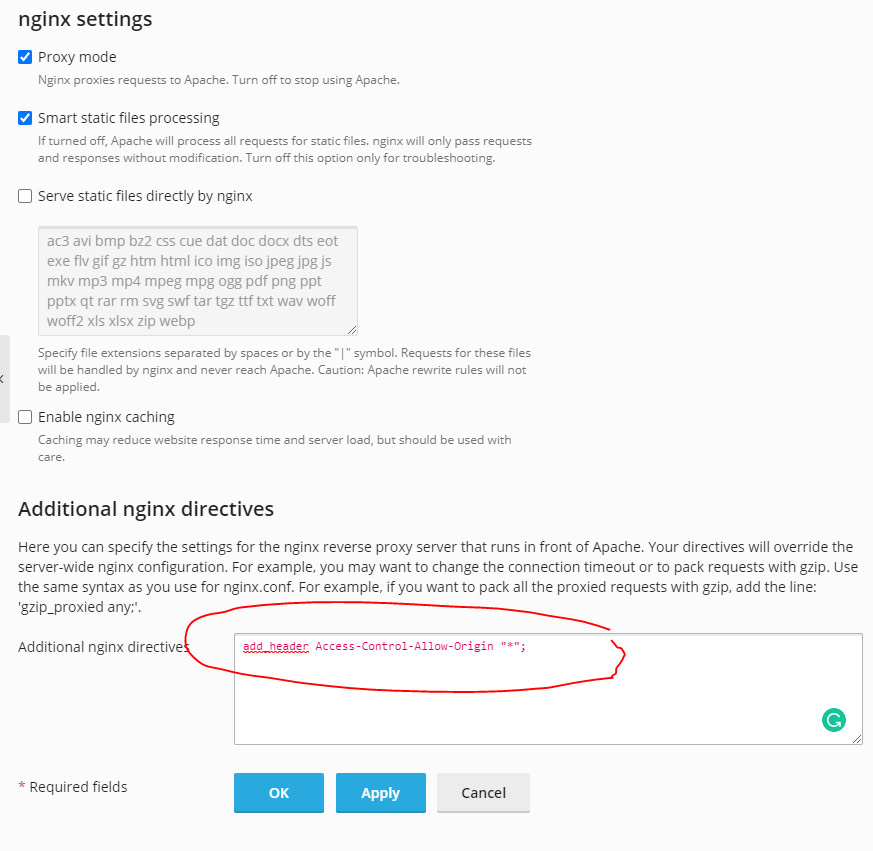Domains > example.com > Apache and nginx settings > Additional nginx directives and insert